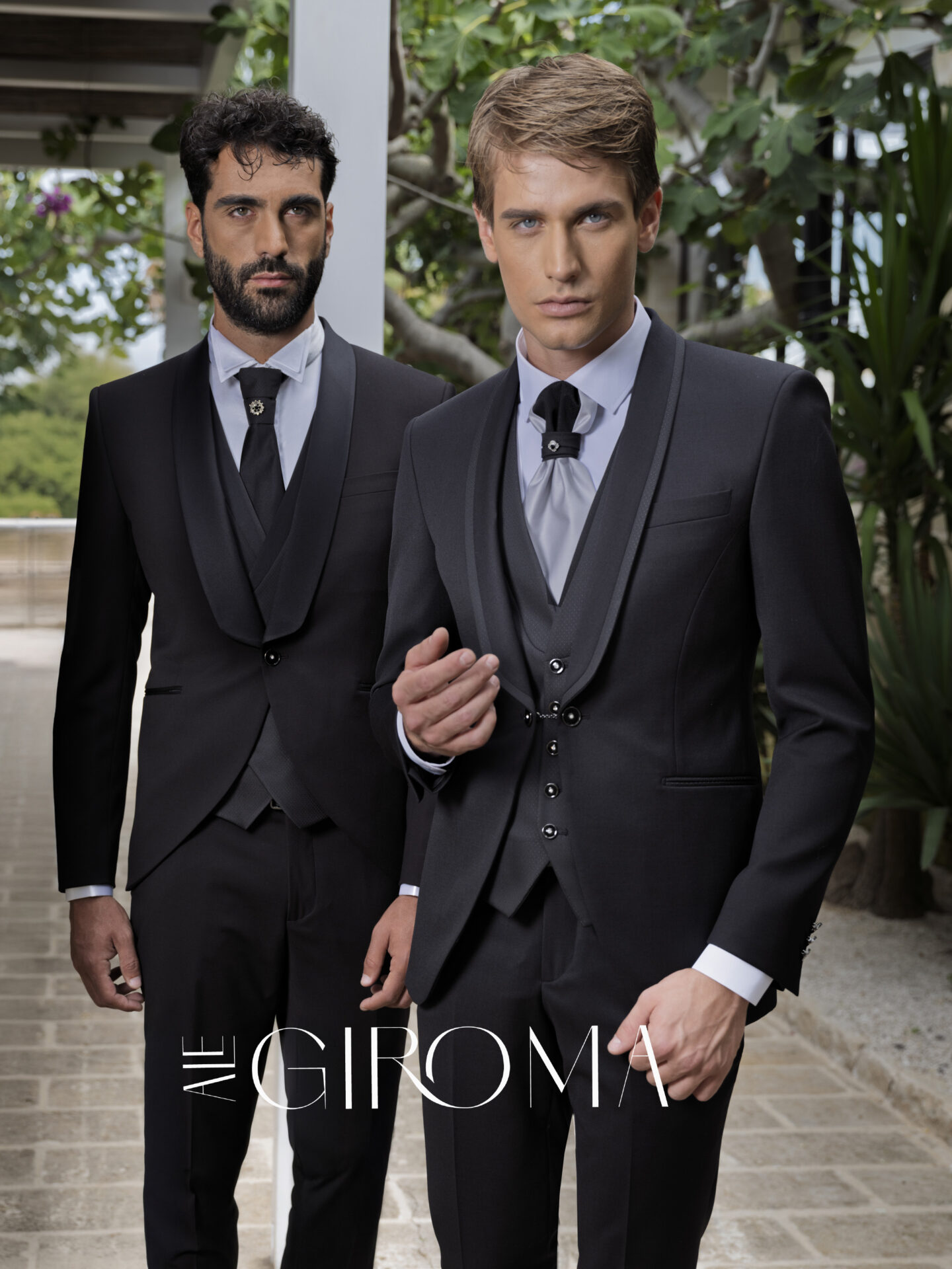 Modello Sinistra: Giacca antracite dal revers a scialle, gilet coordinato, cravatta e spilla decorativa.