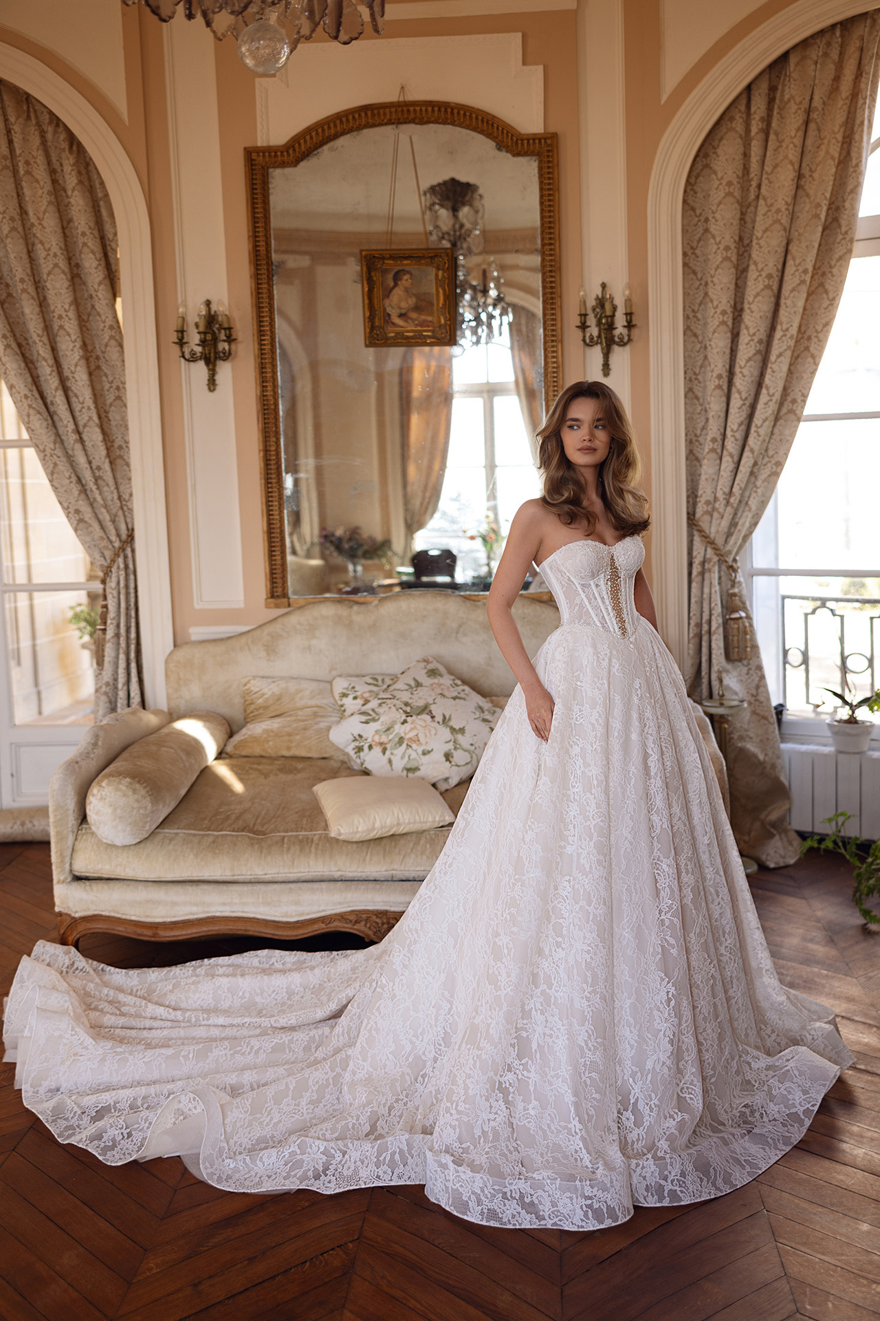 Realizzato in pizzo pregiato, con strascico elegante e ricami con perline. Un capolavoro di raffinatezza per il tuo giorno speciale.