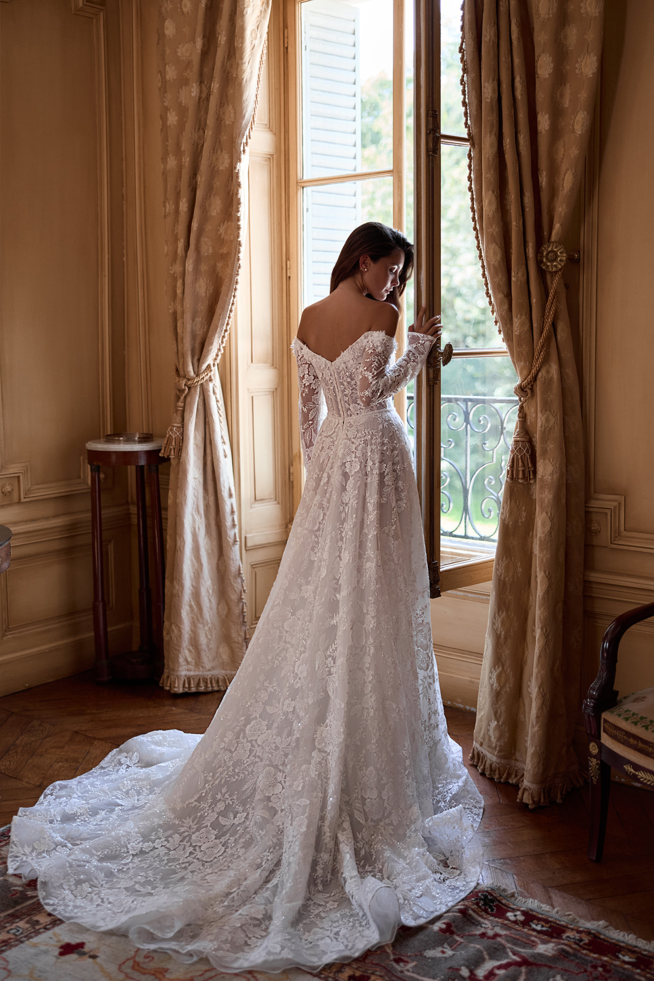 Realizzato in pizzo pregiato, con maniche, applicazioni floreali 3D e ricami con perline. Per una sposa contemporanea che non passa inosservata.