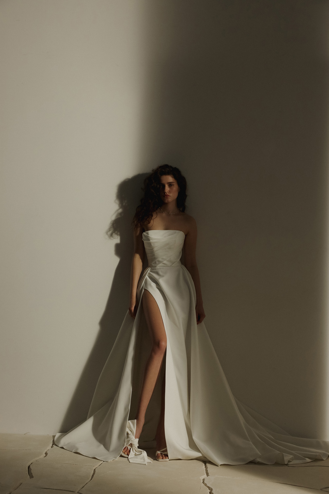 Realizzato in raso pregiato, presenta spacco sensuale. Un abito che racconta la tua storia unica.
