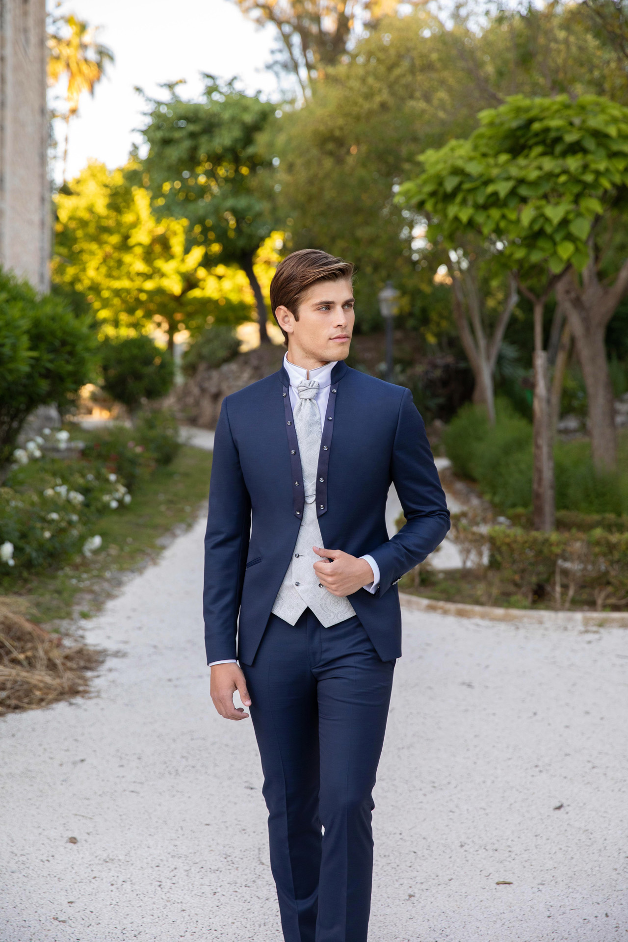 Realizzato con giacca blu dal collo alla coreana, gilet doppiopetto perla, papillon coordinato e tessuti 100% Made in Italy. Contrasto cromatico raffinato e taglio slim fit impeccabile.